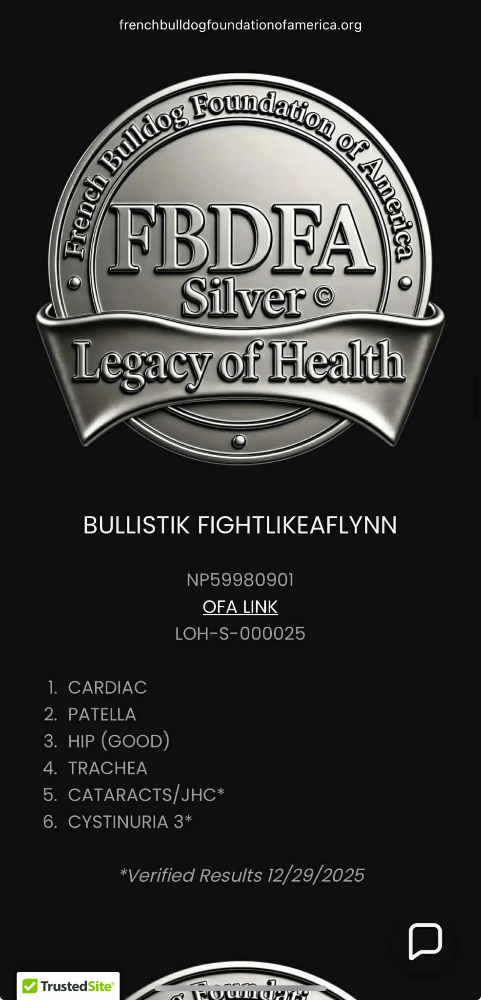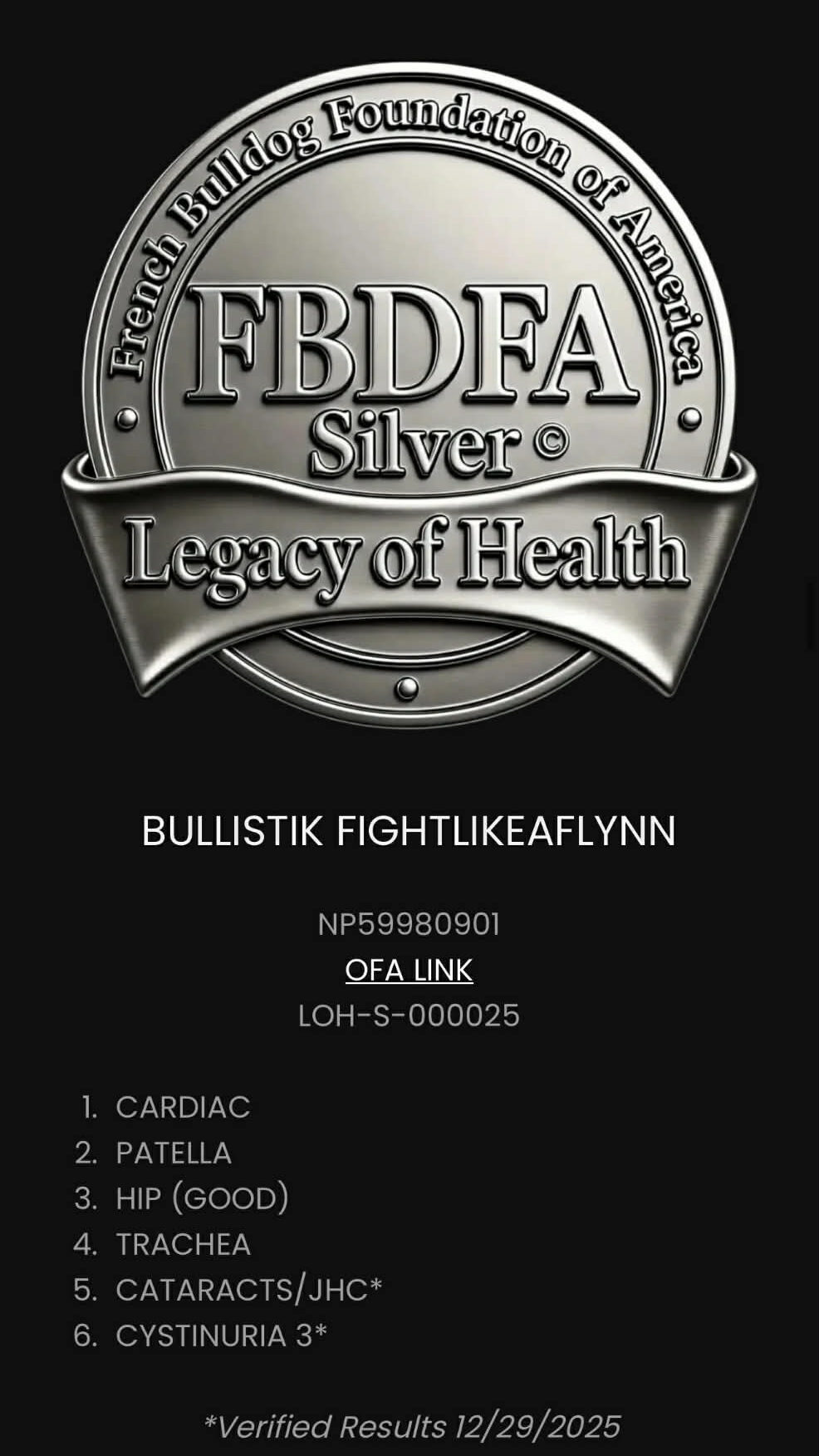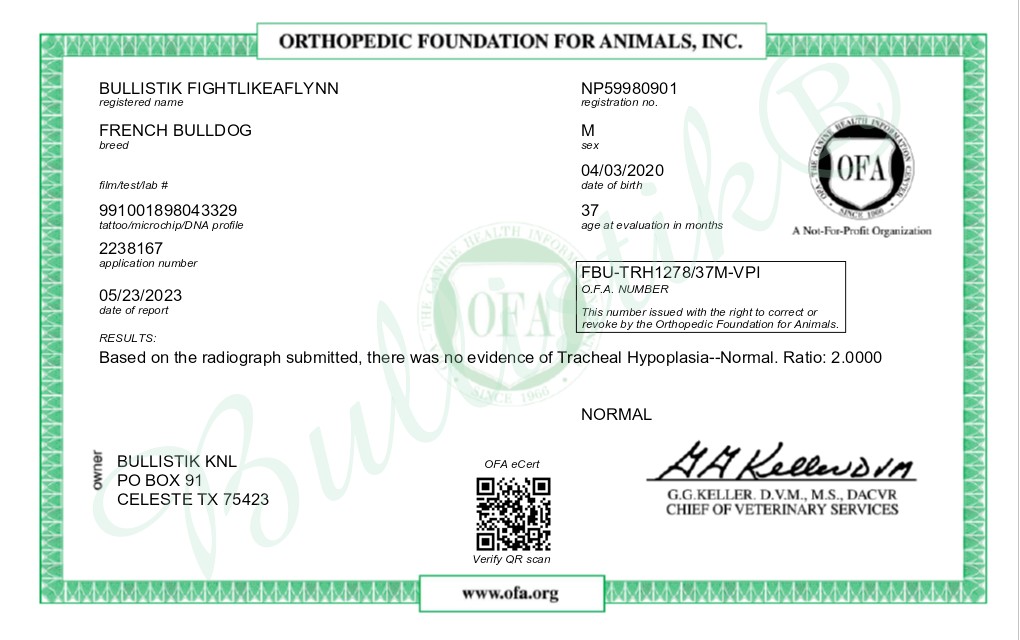 Our black & tan (tricolor) cocoa carrier son of Milkdud, Bullistik FightLikeAFLynn ‘Flynn’, has the following health clearances through the Orthopedic Foundation for Animals and has earned the FBDFA Legacy of Health SILVER LEVEL Award